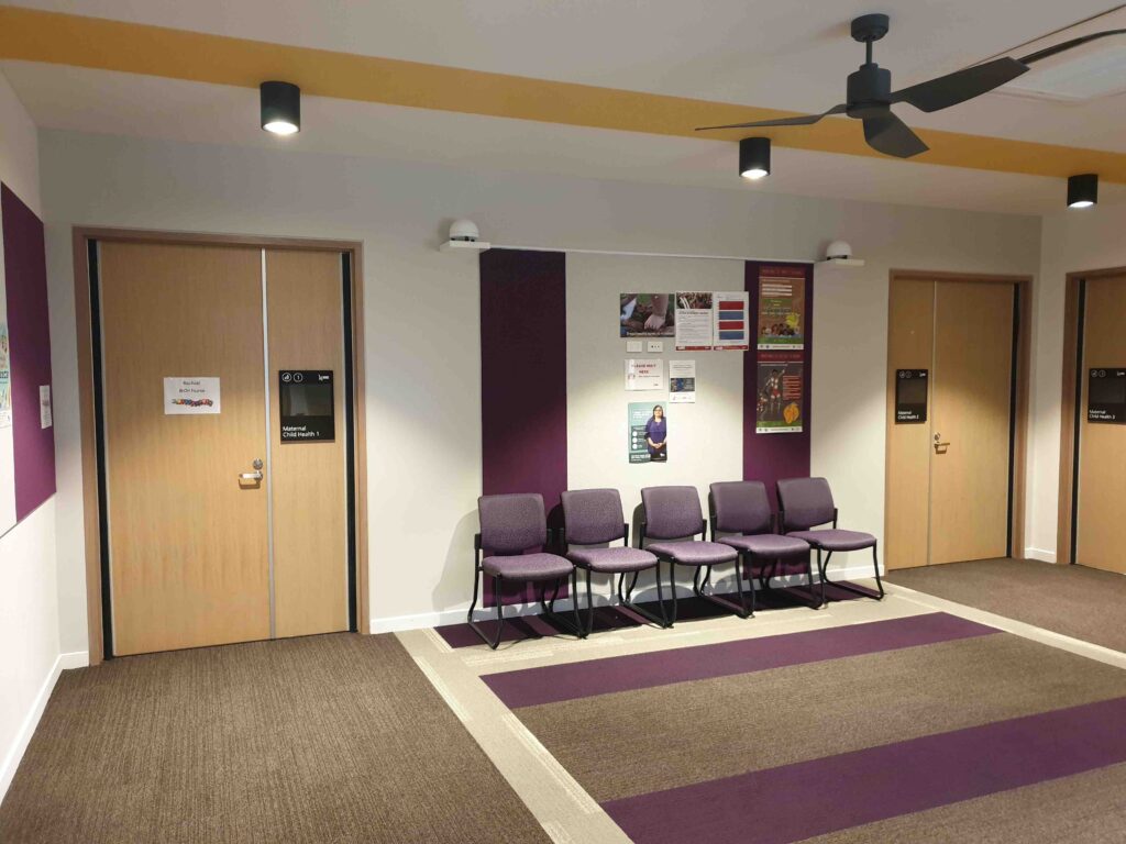 Introducing a masking system will reduce speech intelligibility and create speech privacy. The pictures below provide some examples of such scenarios, including a medical suite waiting area adjacent to consulting rooms in Figure 5, a private meeting room adjacent to the open plan area in Figure 6, and a boardroom adjacent to the waiting and reception area in Figure 7.